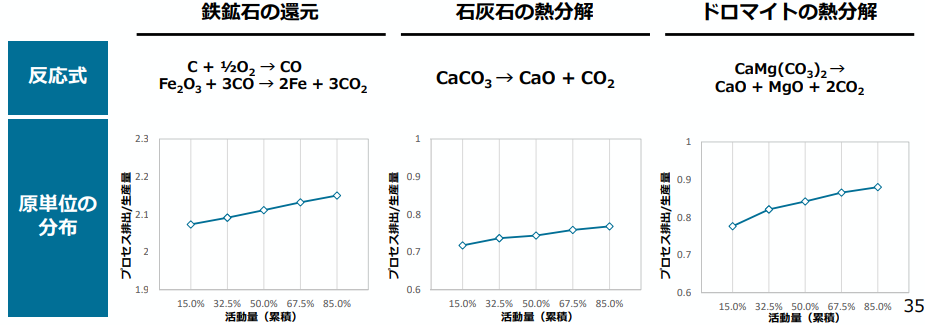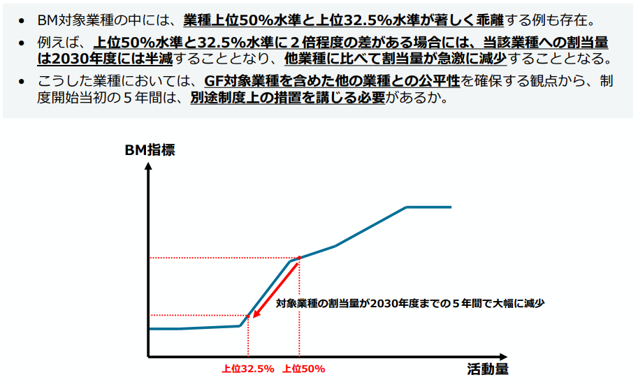 割当対象者間でBMラインを変える際に割当量が急激に低下する懸念があります。プロセス排出分野(鉄鉱石還元、石灰石・ドロマイト熱分解等)では、上位50%ラインから上位32.5%ラインへの原単位の乖離が1~2%程度と極めて小さいことが確認されています。このため、制度移行時における急激な割当激減のリスクは限定的であり、追加的な緩和策(5年間の猶予措置など)は現状想定されていません。またGF削減率についても2030年度まで5年間の枠組みで0.3%/年(合計1.5%)とすることで、初期段階における割当変動を平準化し、企業負担の急増を和らげる配慮がなされています。