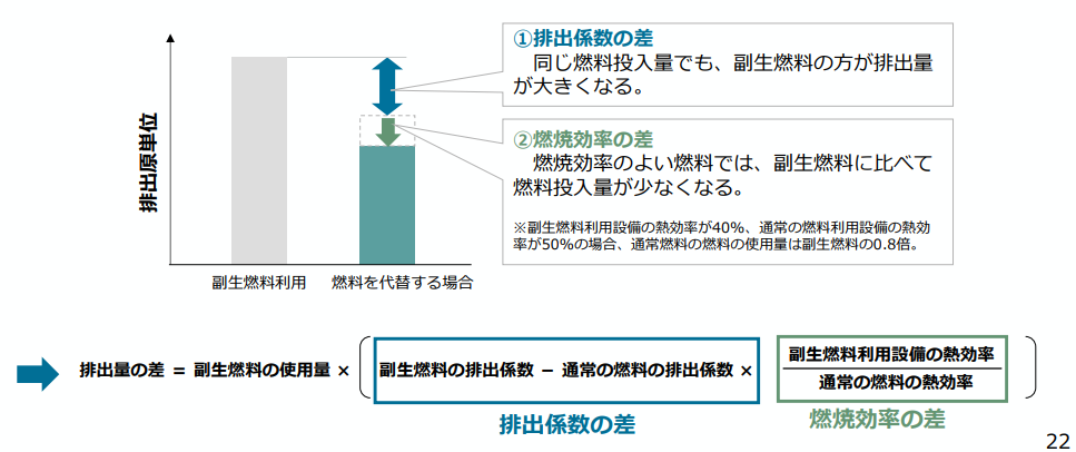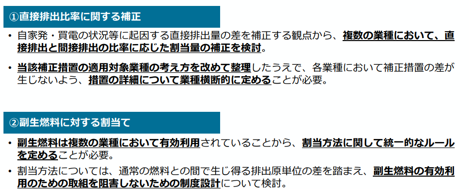 これを踏まえ、検討資料や議論では「副生燃料の有効利用を阻害しないよう、適切な割当方法を検討する必要がある」と指摘されています。具体的にはWG報告でも「副生燃料は複数の業種で有効利用されていることから、割当方法は統一的なルールを定める必要がある」「通常の燃料との排出原単位の差を踏まえ、副生燃料の有効利用を阻害しない制度設計を検討」と明示されています。このように、副生燃料の利用による不利を排除するためには、通常燃料と副生燃料の排出係数・効率差を考慮した補正が不可欠です。