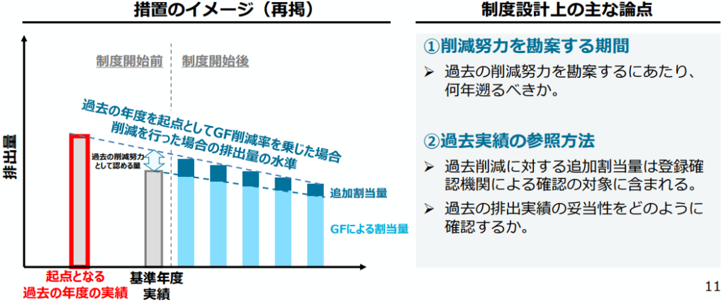早期削減分を算定するにあたっては、起点となる過去年度の設定(何年まで遡るか)や過去の削減量の確認方法が検討課題とされています。現行の温室効果ガス排出量報告制度(温対法に基づくSHK制度)で各事業所が報告している2013年度前後3年間の平均排出量など、利用可能なデータを活用して基準値を定める方向です。また、事業所の新設・廃止による排出量変動も考慮し、事業所単位で過去削減量を算定して企業全体で合算する方法が検討されています。削減量の算定結果については第三者機関(登録確認機関)による検証も受け、過去の排出実績の信頼性を担保した上で割当量に反映することになります。
