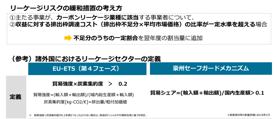 カーボンリーケージ(炭素漏出)とは、排出規制によるコスト負担により産業が国外に移転したり、海外競合品に市場を奪われたりするリスクを指します。GX-ETSの設計では、このリスクを低減しつつ国内産業の競争力を守るための緩和措置が盛り込まれています。具体的には、貿易競争が激しく炭素コスト負担の大きい業種を「カーボンリーケージリスクが高い業種」と定義し、そうした業種に属する事業者で排出枠購入コストが収益に占める割合が一定の水準を超える場合には、不足している排出枠の一部を翌年度の無料割当として追加付与します。この措置により、急激なコスト増による企業収益の圧迫を和らげ、国内からの生産移転(リーケージ)を防ぐ狙いがあります。