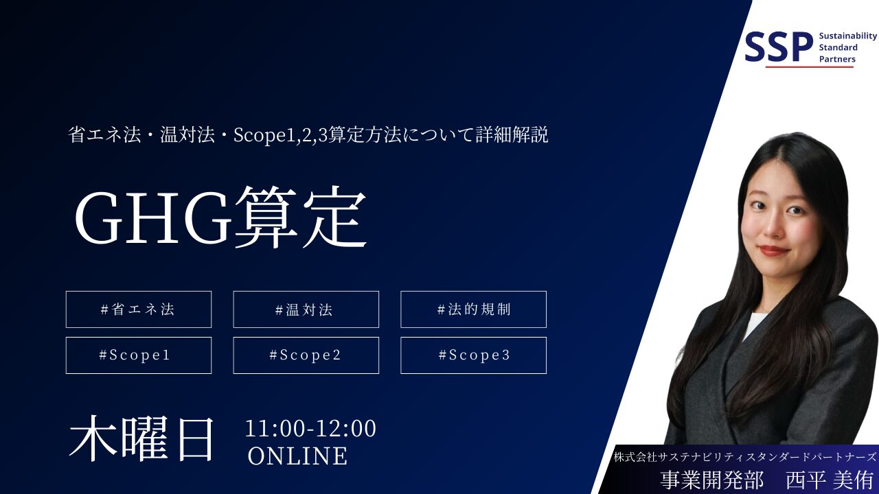 株式会社サステナビリティスタンダードパートナーズ(SSP)は、温室効果ガス排出量の算定に関する実務セミナーを開催いたします。本セミナーでは、省エネ法・温対法の制度理解を出発点としながら、Scope1・2・3の排出量算定について、より実務的・体系的に学べる内容を提供します。特にScope3については、全15カテゴリを対象に、カテゴリごとの定義、算定対象範囲、必要な社内データ、計算式例などを個別に解説します。Scope3は部署横断的な連携が求められる分野であり、実務担当者が直面する「どこまでデータを取るか?」「算定ロジックはどう選ぶか?」といった悩みに具体的なヒントをご提供します。