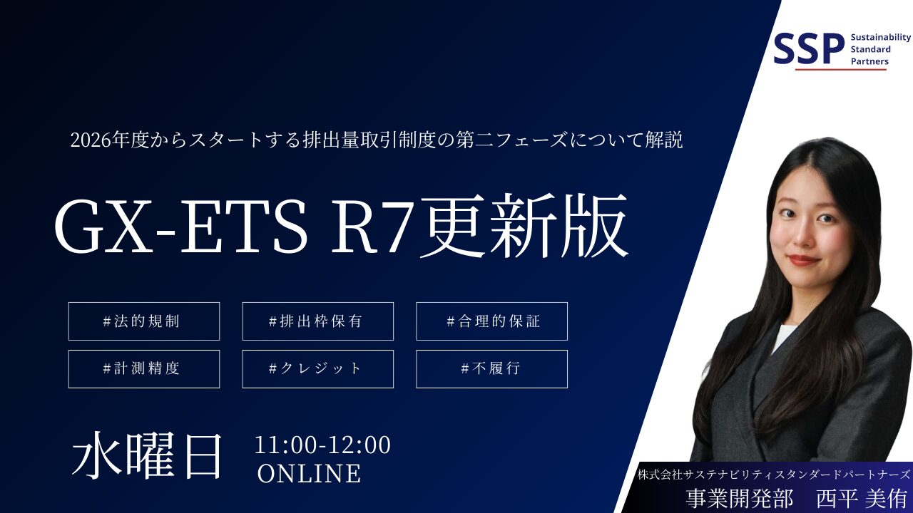 株式会社サステナビリティスタンダードパートナーズは、2026 年度から本格施行されるGX-ETS第2フェーズへの実務対応を解説するオンラインセミナーを開催いたします。本セミナーでは、令和7年7月2日に経済産業省GXグループが公表した「排出量取引制度の詳細設計に向けた検討方針」を反映し、排出枠の割当申請・保有義務、第三者保証(限定的保証→段階的合理的保証)、未履行時ペナルティ、J-クレジット/JCM活用上限等の最新要件を網羅的にご説明いたします。制度対象となる直接排出量10万 t-CO₂以上の事業者はもとより、GXリーグ参画を検討される企業の皆様にも有益な内容です。