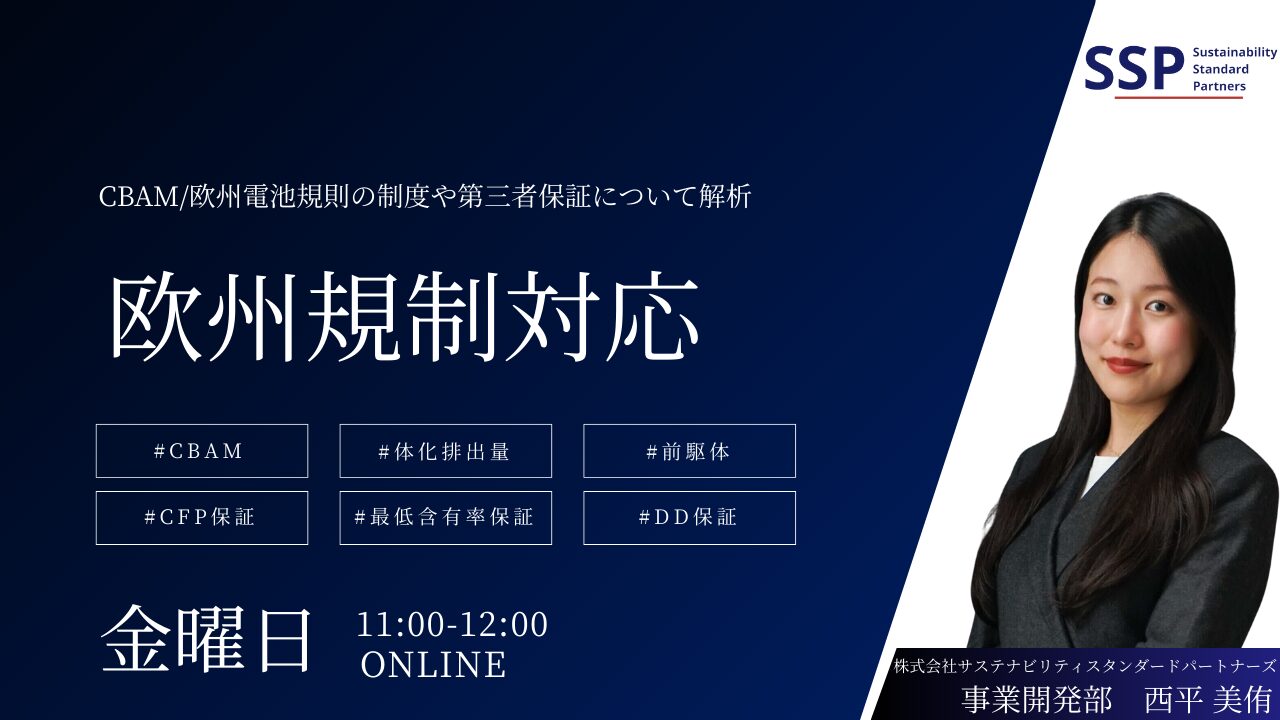 株式会社サステナビリティスタンダードパートナーズ(SSP)は、EUの主要規制「CBAM(炭素国境調整措置)」および「欧州電池規則(Battery Regulation)」と、それらに不可欠な第三者保証の要件を、実務視点で整理・解説するオンラインセミナーを開催します。本セミナーでは、CBAMの対象品目・報告内容・排出範囲を体系的に解説し、第三者検証の勘所も取り上げます。あわせて、欧州電池規則の全体像、適合性評価や認証機関関与の考え方を整理し、CFP算定・最低含有率・デューデリジェンスの検証基準について解説します。